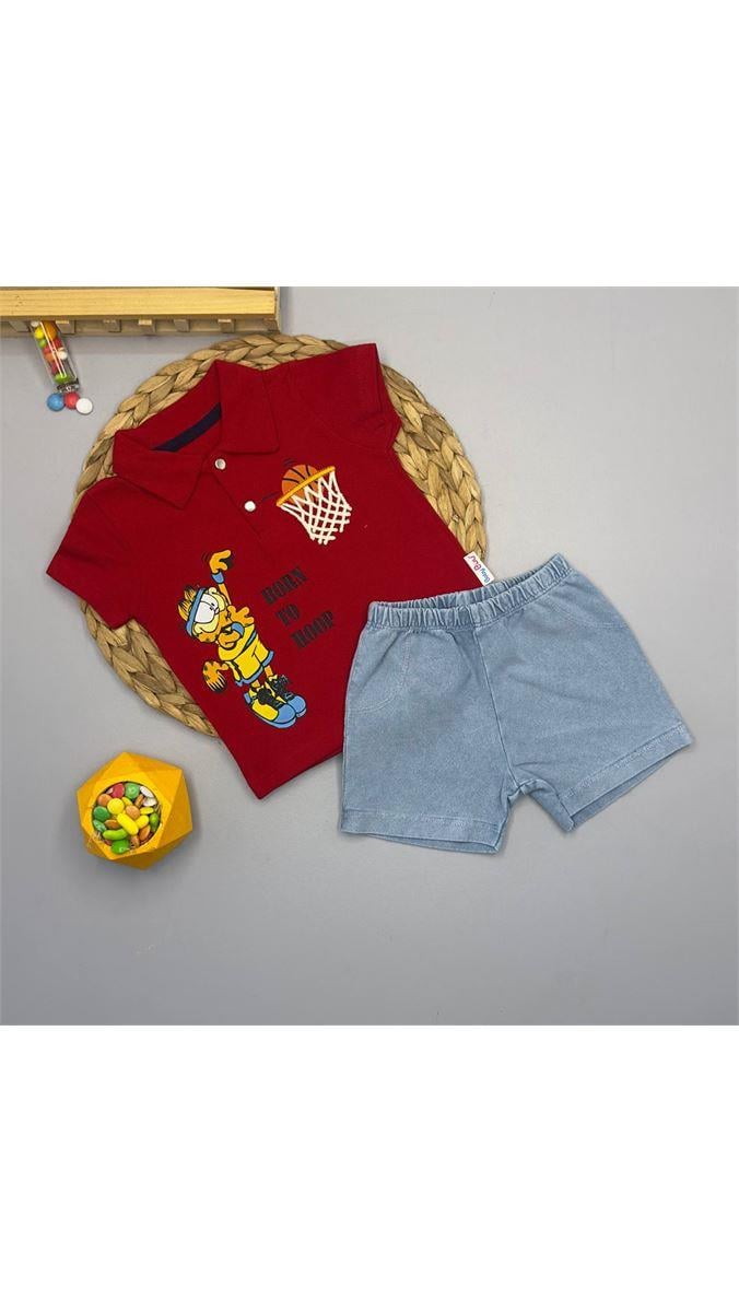 0216 Born To Baskılı Kot Şortlu Polo Yaka İkili Takım KIRMIZI