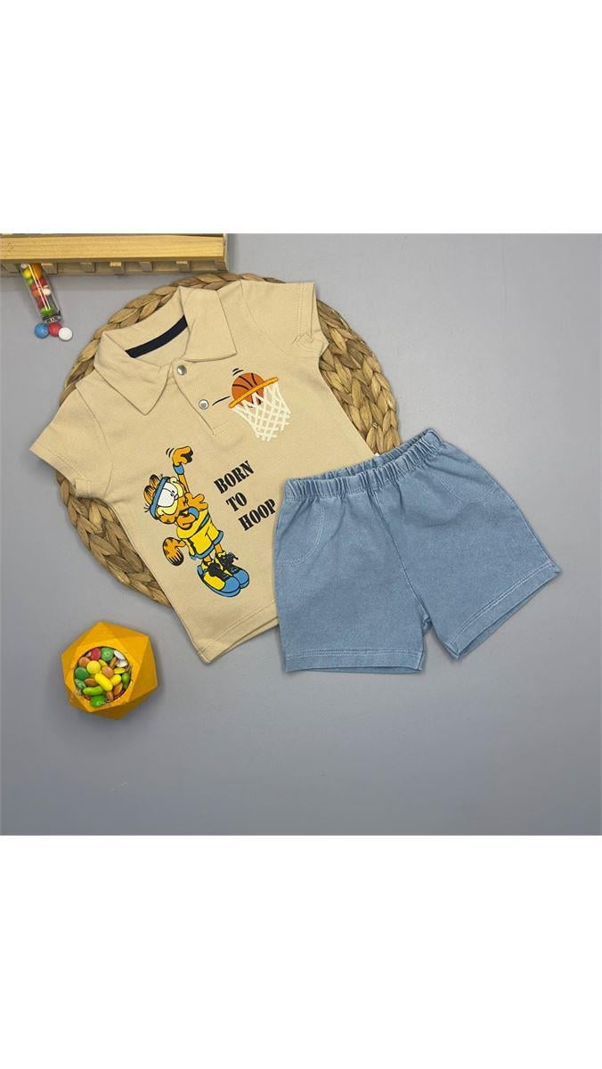 0216 Born To Baskılı Kot Şortlu Polo Yaka İkili Takım TAŞ