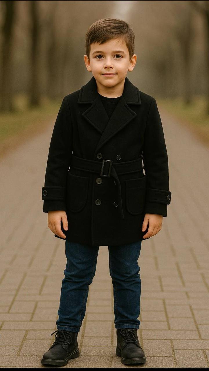 0308 Kuşak Detaylı Erkek çocuk Kaşe Kaban SİYAH