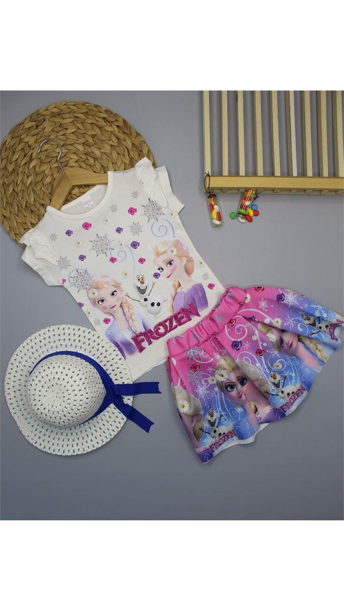 0424 Kardan Adam & Elsa Baskılı Şapkalı Takım PEMBE