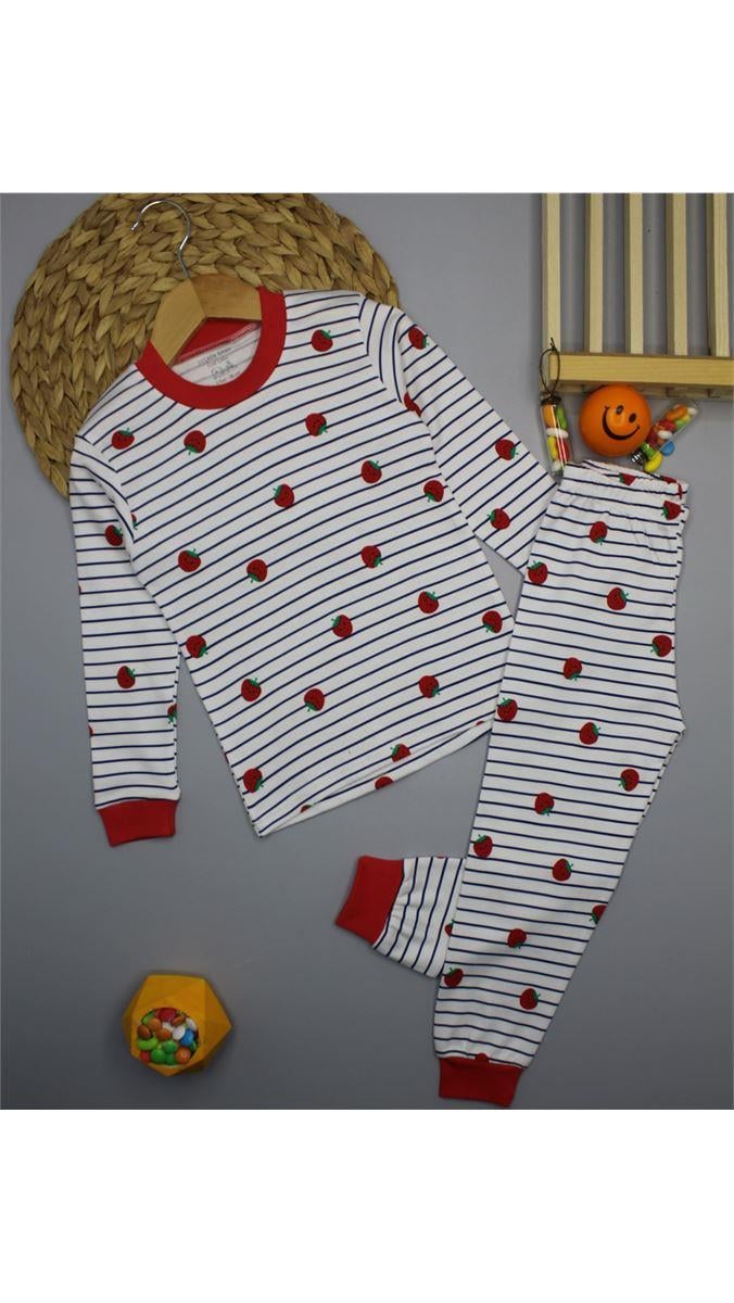 0434-4  Bisiklet Yaka Çilekli Pijama Takımı BEYAZ