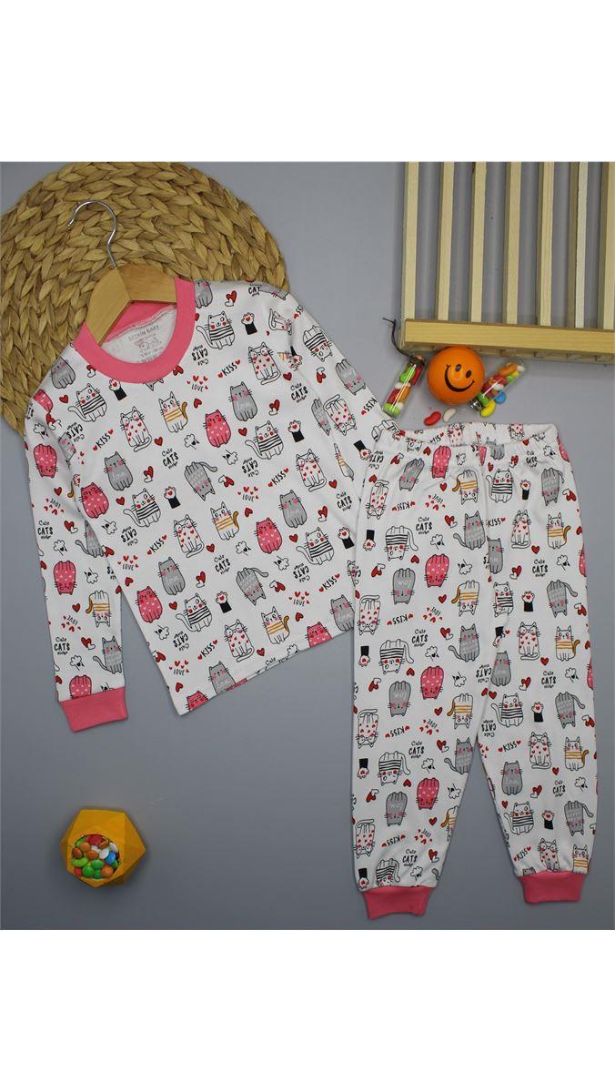 0434-5 Bisiklet Yaka Kedi Baskılı Pijama Takımı BEYAZ