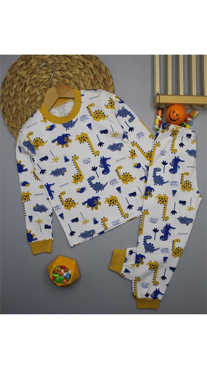 0434 Bisiklet Yaka Dinozorlu Pijama Takımı BEYAZ