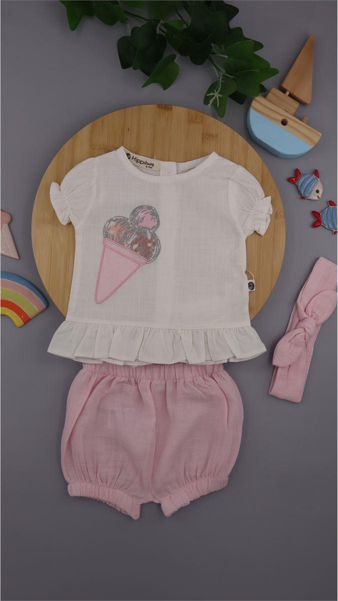 0515 Dondurma Baskılı Şortlu Bandanalı Kız Bebek Takım PEMBE