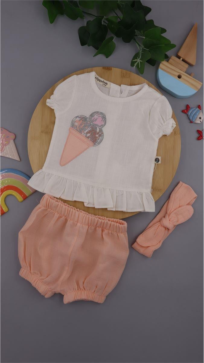 0515 Dondurma Baskılı Şortlu Bandanalı Kız Bebek Takım PUDRA