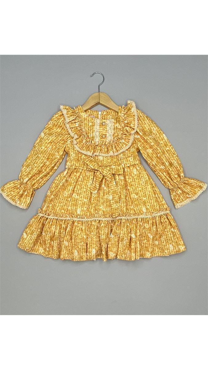 0652 Bebe Yaka Desenli Kadife Elbise SARI
