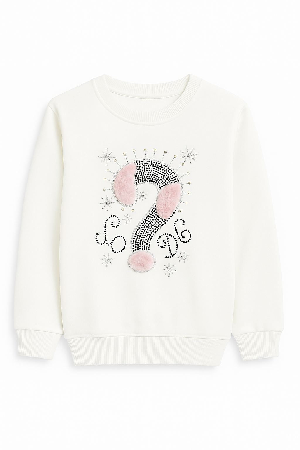 0904 Taşlı Peluş Soru İşaretli Sweat BEYAZ