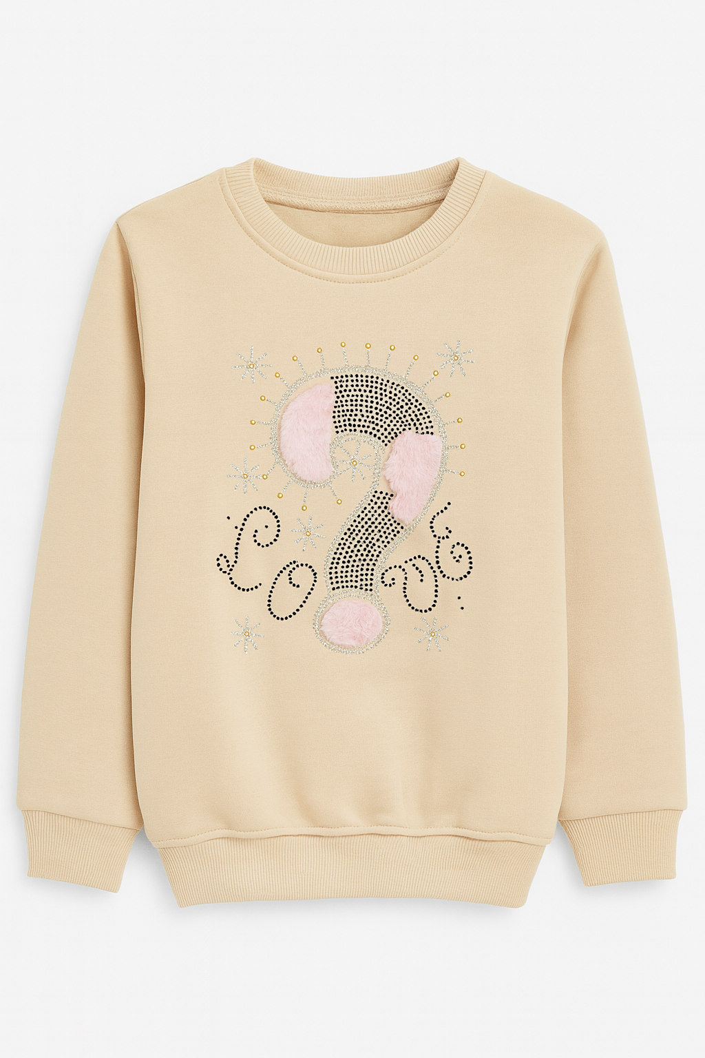0904 Taşlı Peluş Soru İşaretli Sweat KREM
