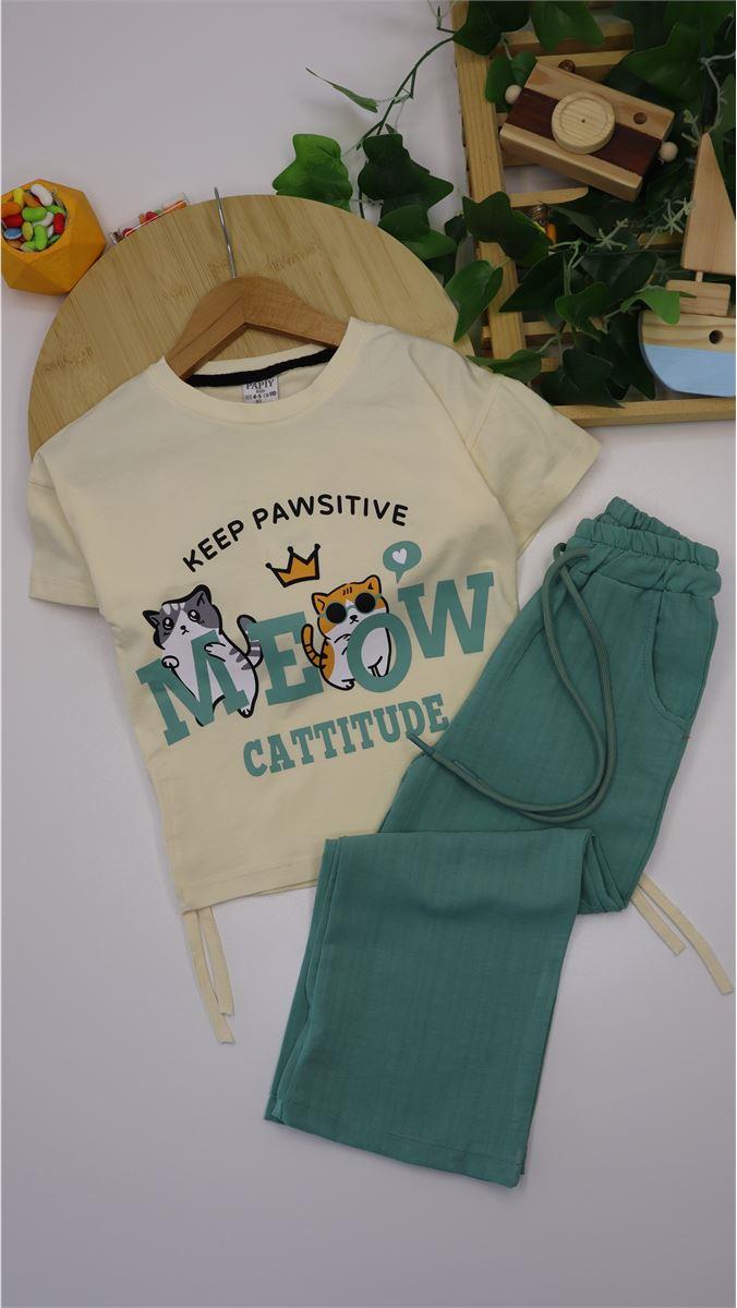 1012 Kedi Modelli Altı Keten Kız Takım YEŞİL