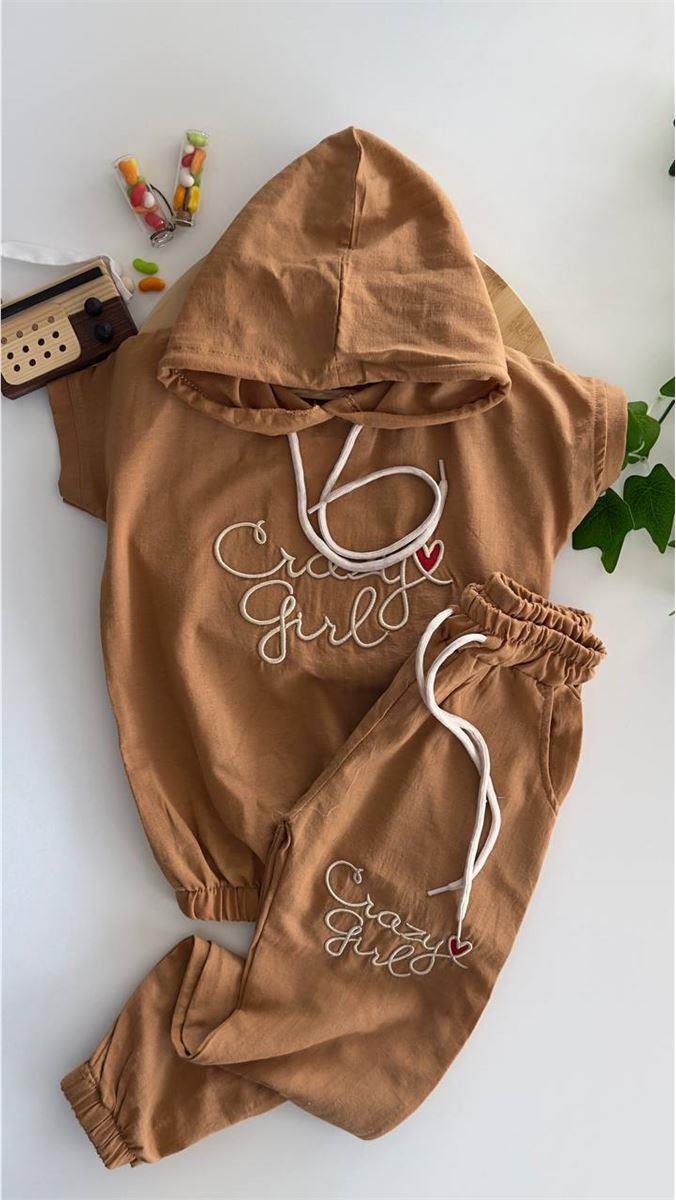 1015 Crazy Girl Yazılı Kapişonlu İkili Ayrobin Kız Takım KAHVERENGİ