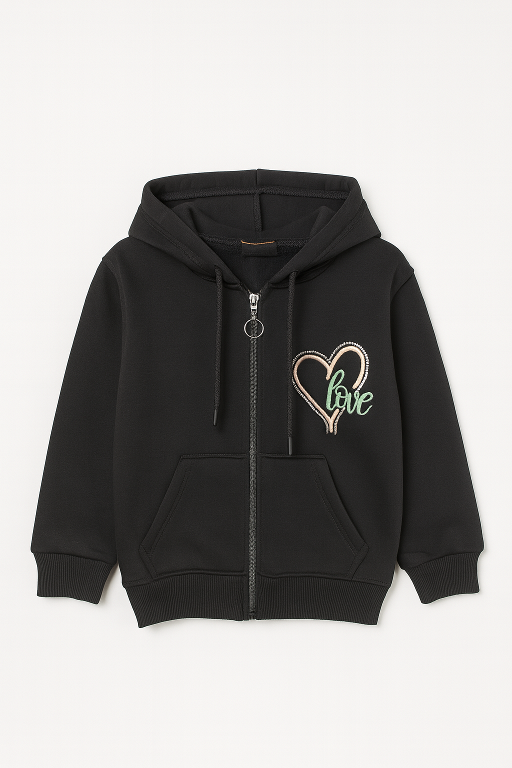 10908 Fermuarlı Love Kalpli Nakış Taşlı Şardonlu Kapişonlu Sweat SİYAH