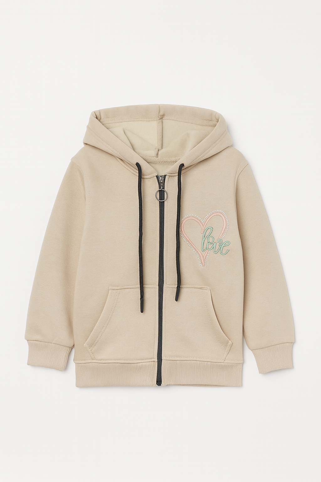 10908 Fermuarlı Love Kalpli Nakış Taşlı Şardonlu Kapişonlu Sweat TAŞ