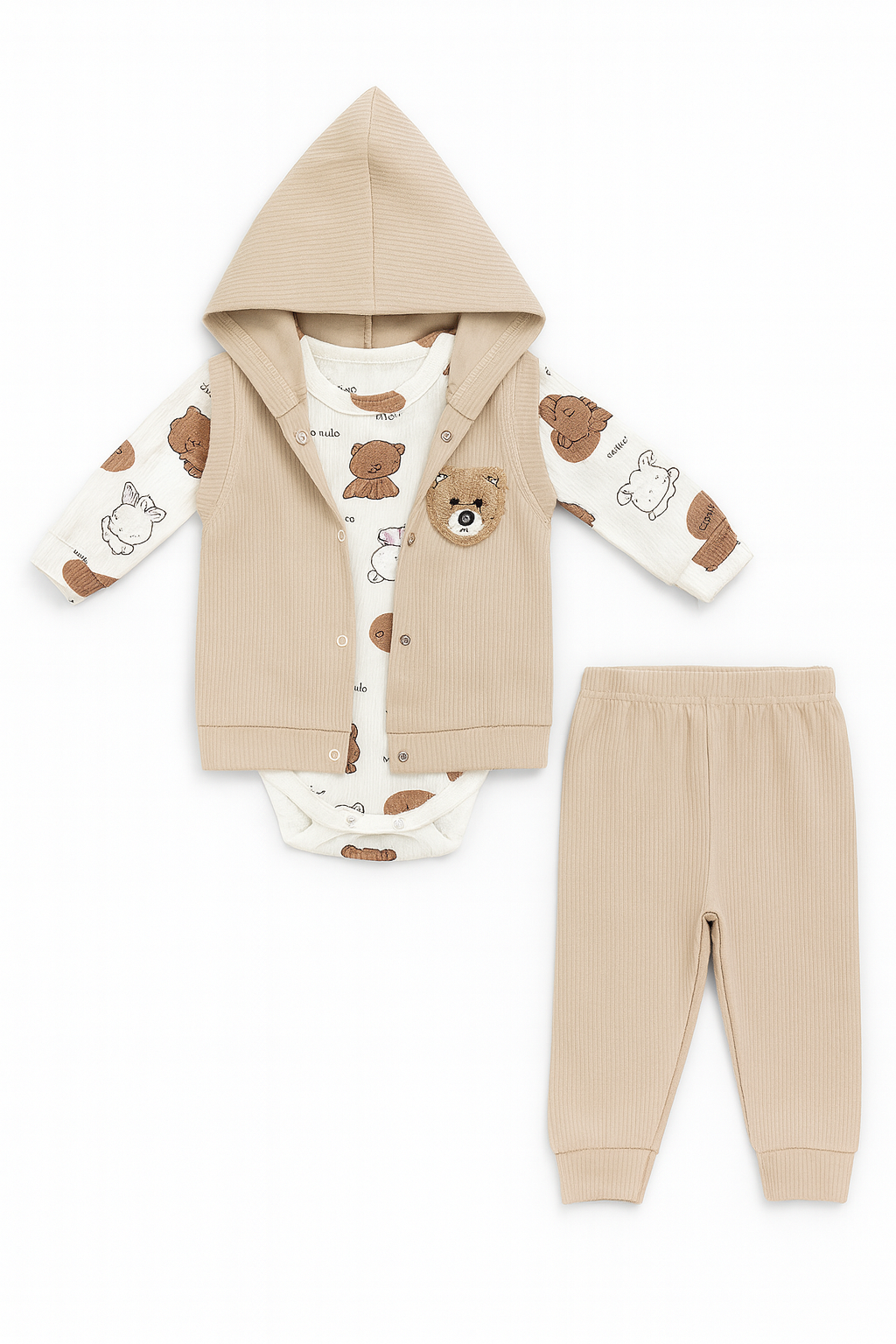 1162 Ayıcık Baskılı Fitilli Üçlü Bebe Takım KAHVE