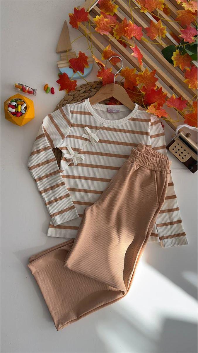 12389 Yatay Çizgili Fiyonk Detaylı Kız Çocuk Takım SOMON