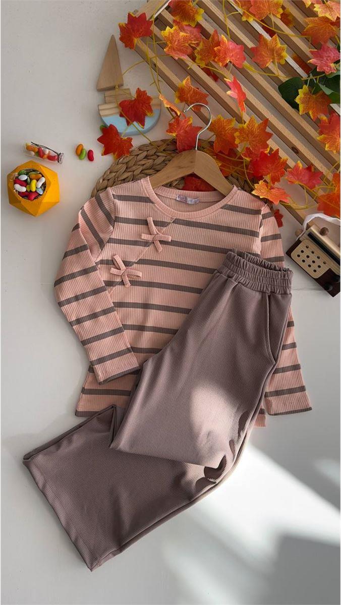 12389 Yatay Çizgili Fiyonk Detaylı Kız Çocuk Takım VZN