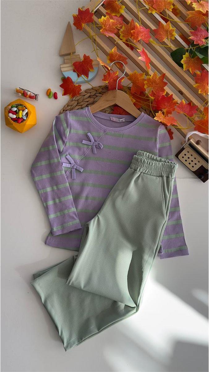 12389 Yatay Çizgili Fiyonk Detaylı Kız Çocuk Takım YEŞİL