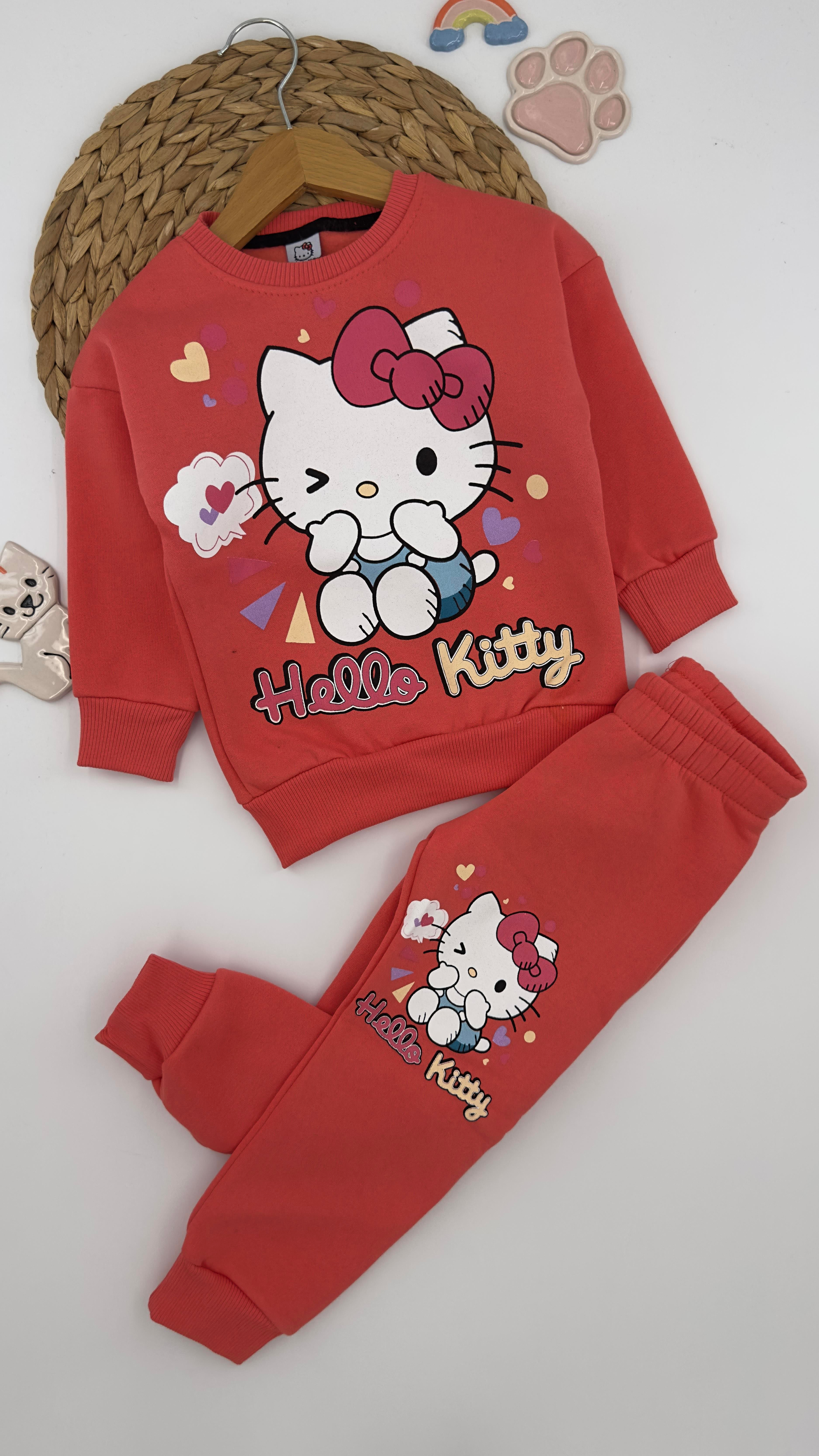 1454 Hello Kity Baskılı Üç İplik Şardonlu Kız Çocuk Takım NAR CICEGI