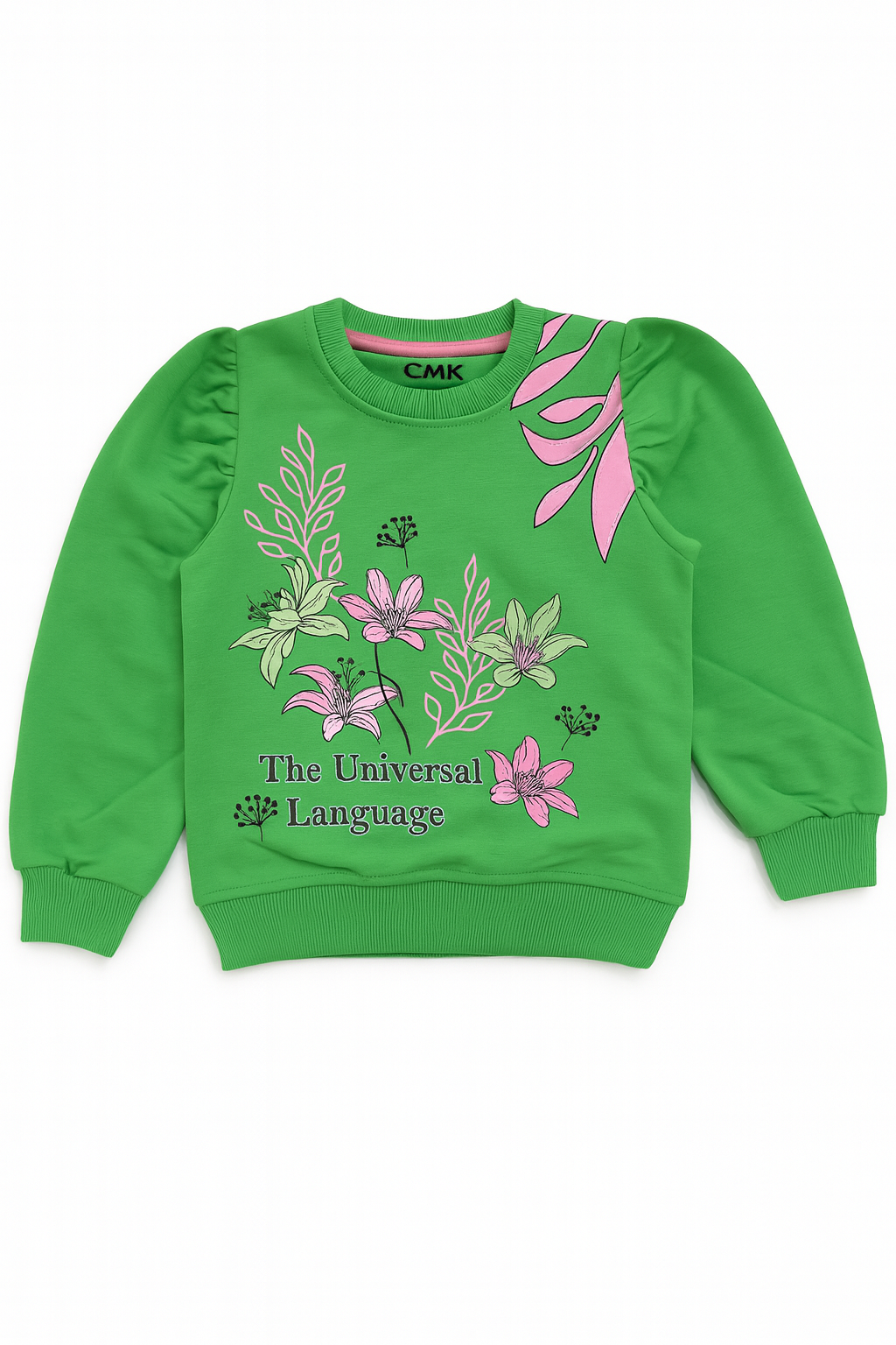 170305 Çiçek Desenli Language Kız Çocuk Swetshirt YEŞİL