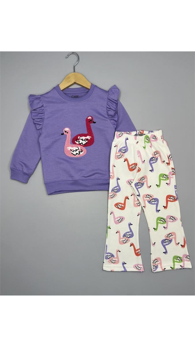 170910 Omuz Fırfırlı Ördek Nakışlı İspanyol Paça Takım LİLA