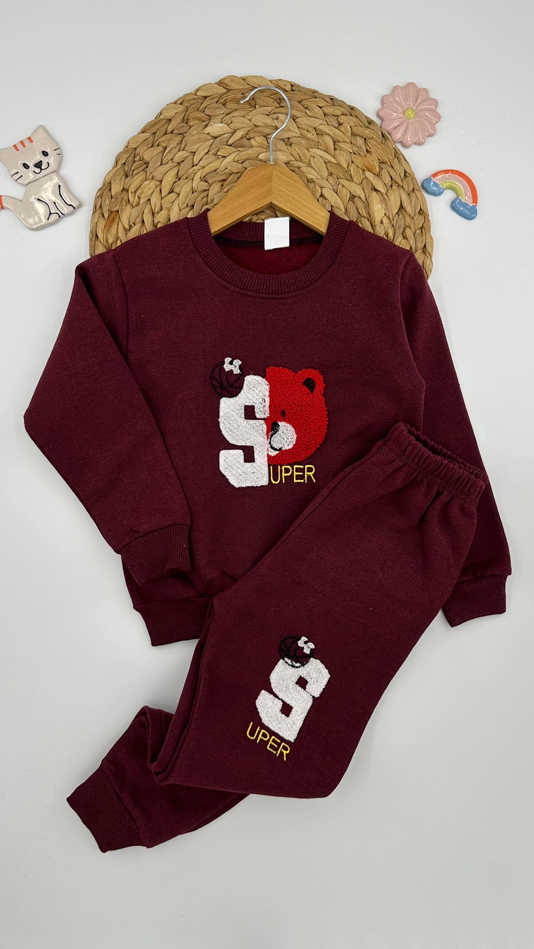 1814 Ayıcık Desenli İki İp Şardonlu Çocuk Takım BORDO