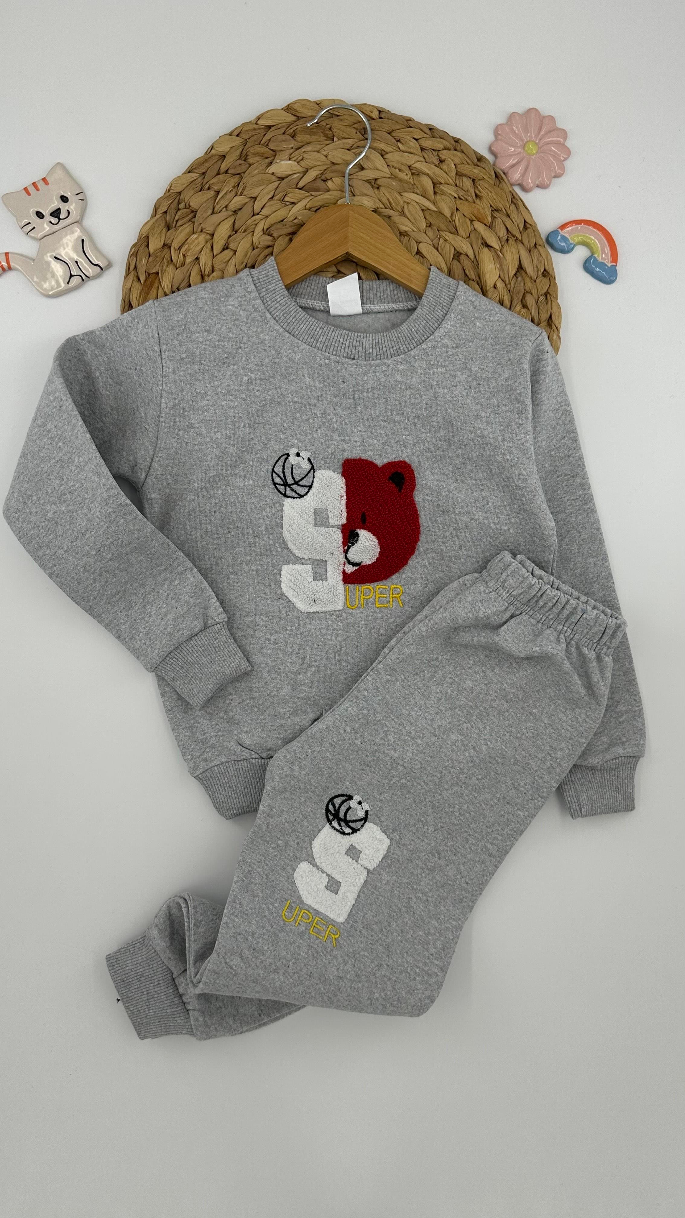 1814 Ayıcık Desenli İki İp Şardonlu Çocuk Takım GRİ