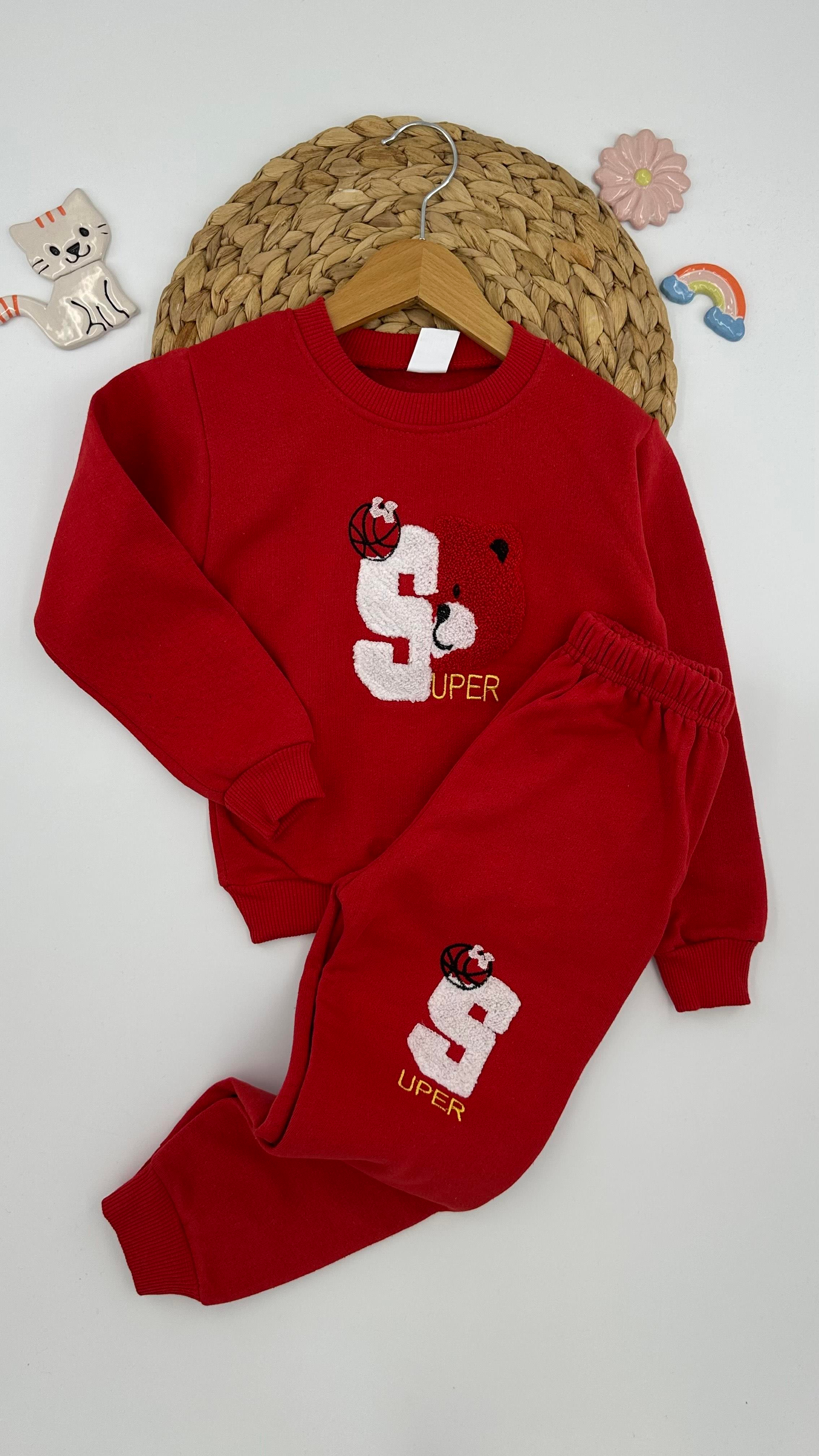 1814 Ayıcık Desenli İki İp Şardonlu Çocuk Takım KIRMIZI