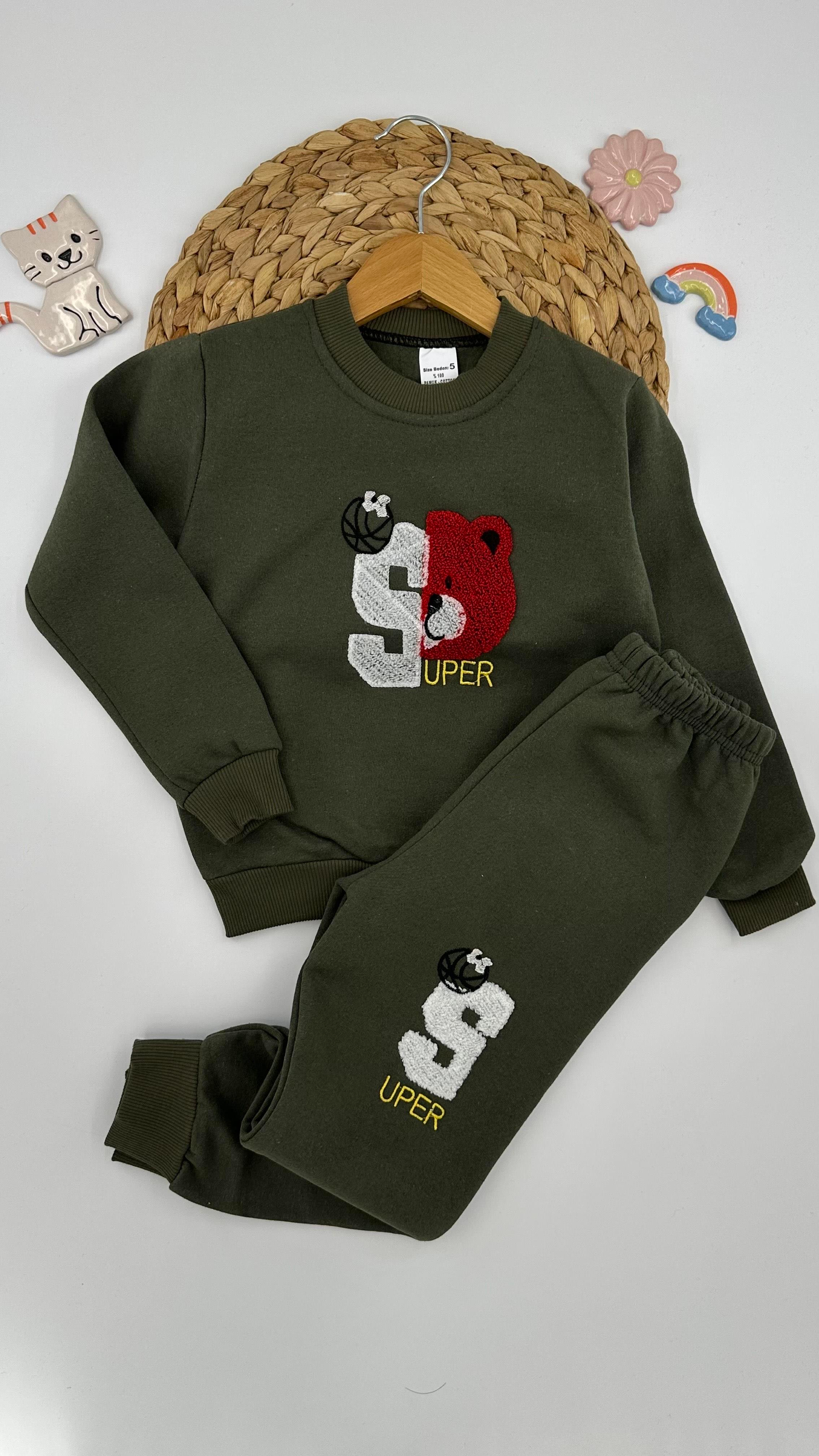 1814 Ayıcık Desenli İki İp Şardonlu Çocuk Takım YEŞİL