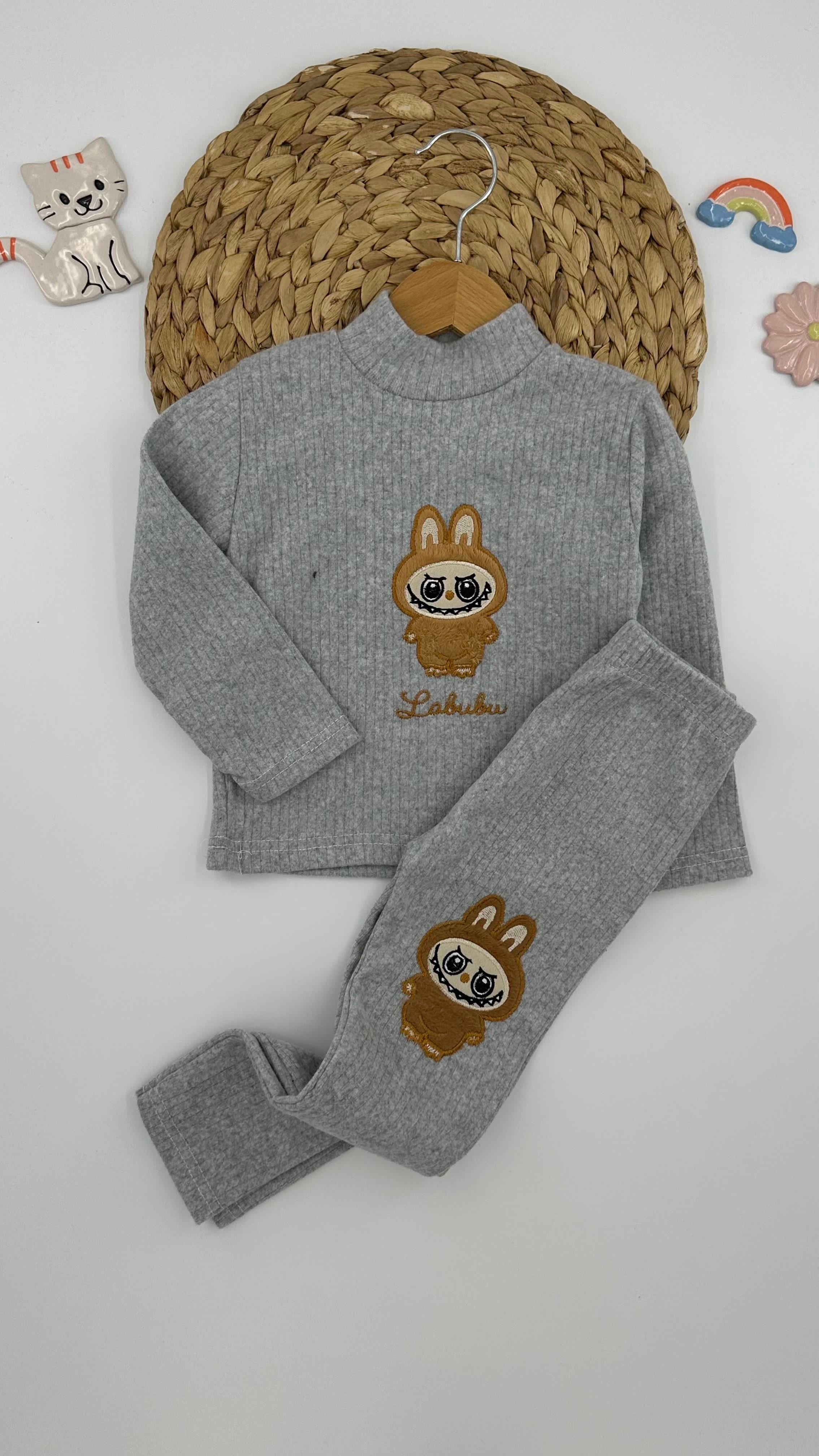1836-1 Labubu Nakışlı Fitilli Kız Çocuk Takım GRİ