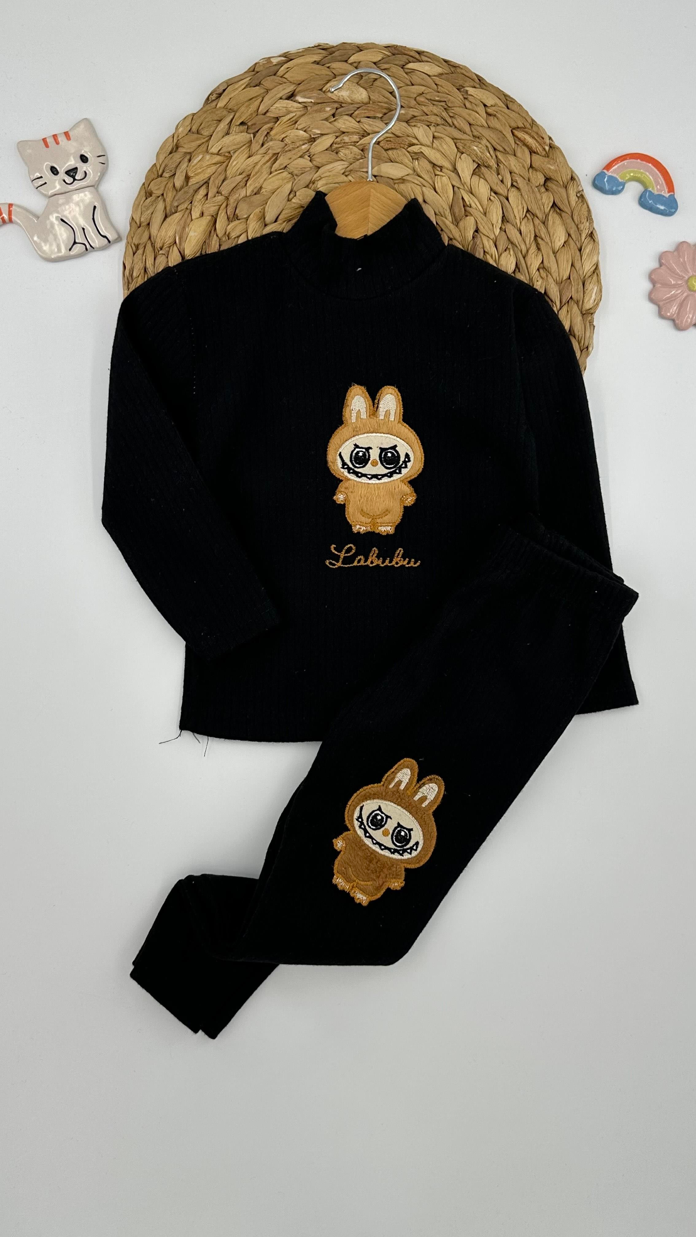 1836-1 Labubu Nakışlı Fitilli Kız Çocuk Takım SİYAH