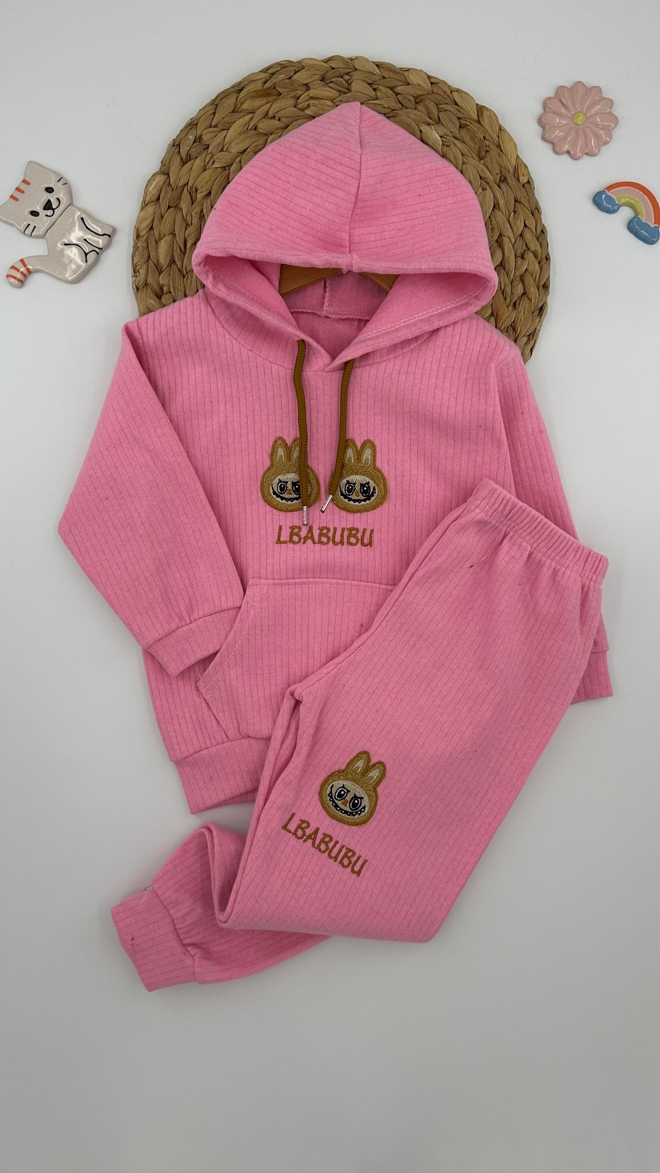 1836-2 Labubu Nakışlı Fitilli Kanguru Cepli Kapişonlu Kız Çocuk Takım PEMBE