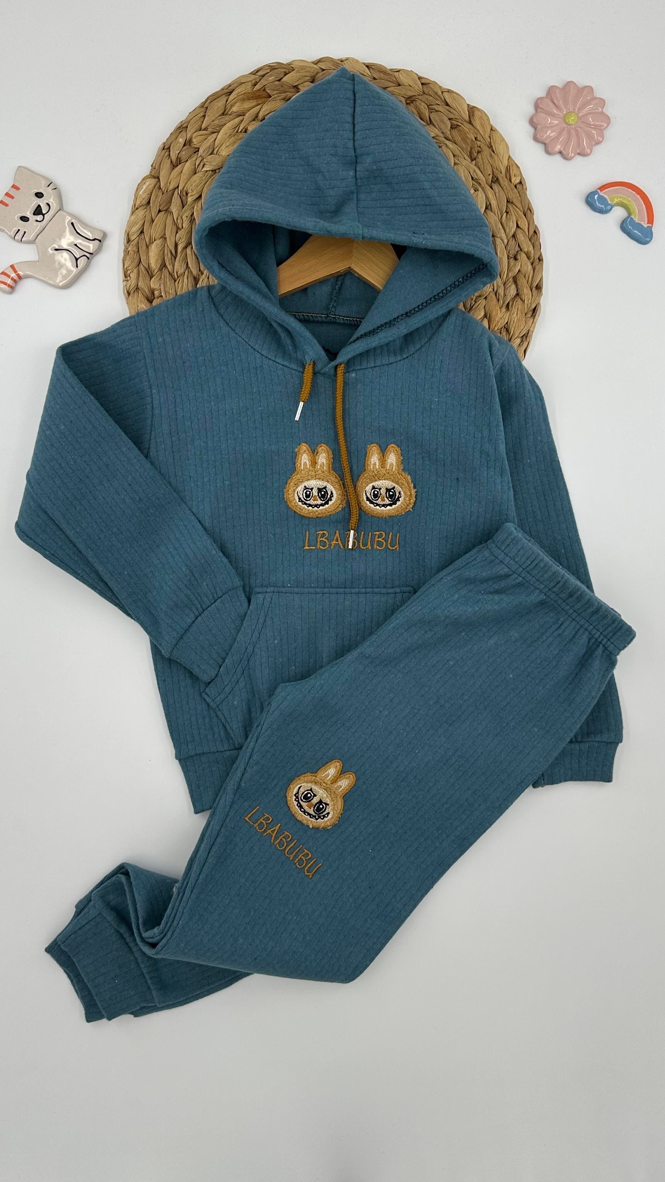 1836-2 Labubu Nakışlı Fitilli Kanguru Cepli Kapişonlu Kız Çocuk Takım PTRMV