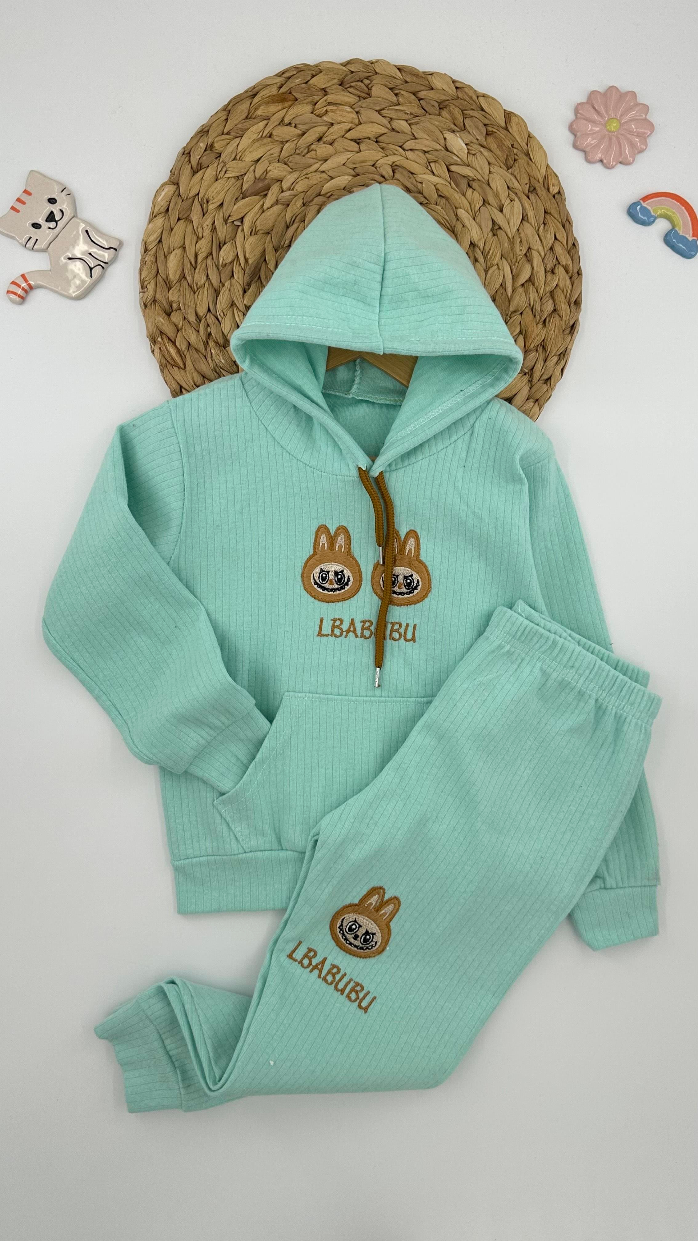 1836-2 Labubu Nakışlı Fitilli Kanguru Cepli Kapişonlu Kız Çocuk Takım SUYS