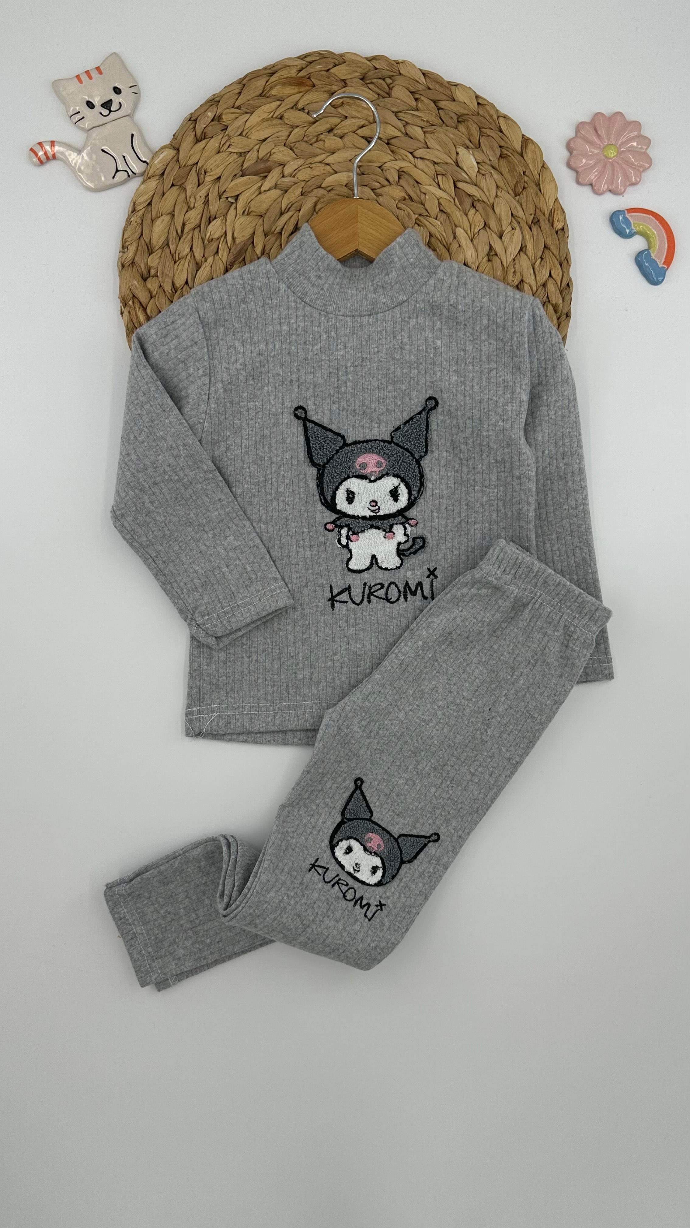 1836 Kromi Nakışlı Fitilli Kız Çocuk Takım GRİ
