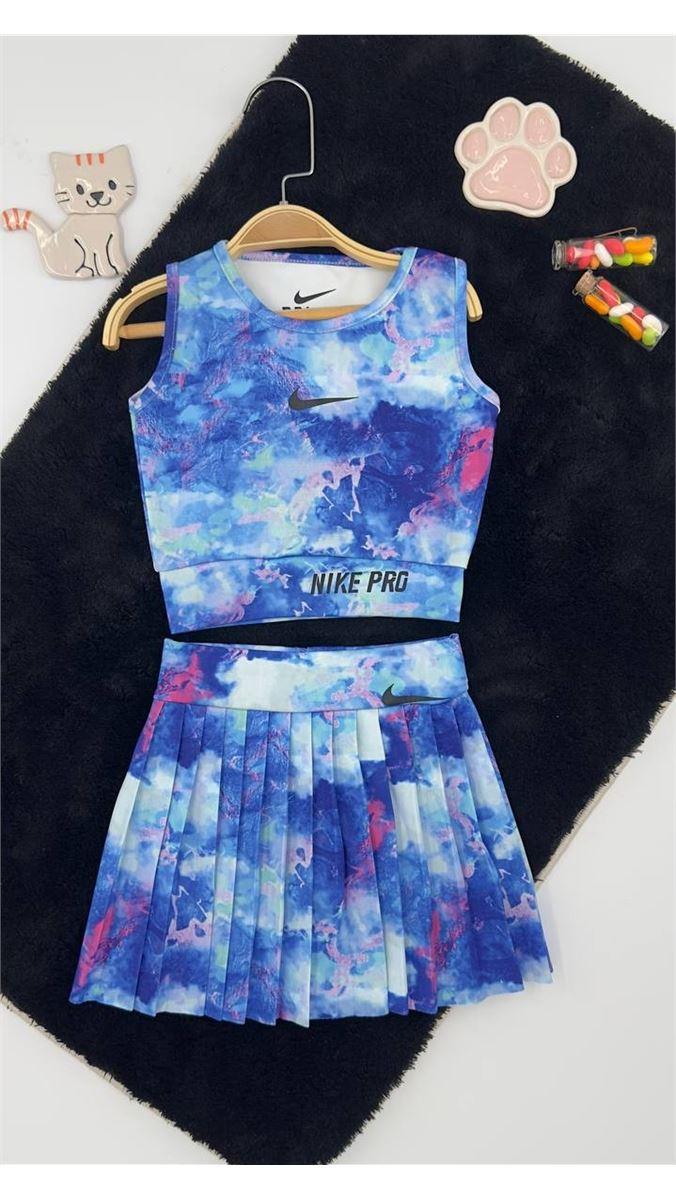 20026 NKP Baskılı Şort Etekli Croplu Mayo Takım MAVİ