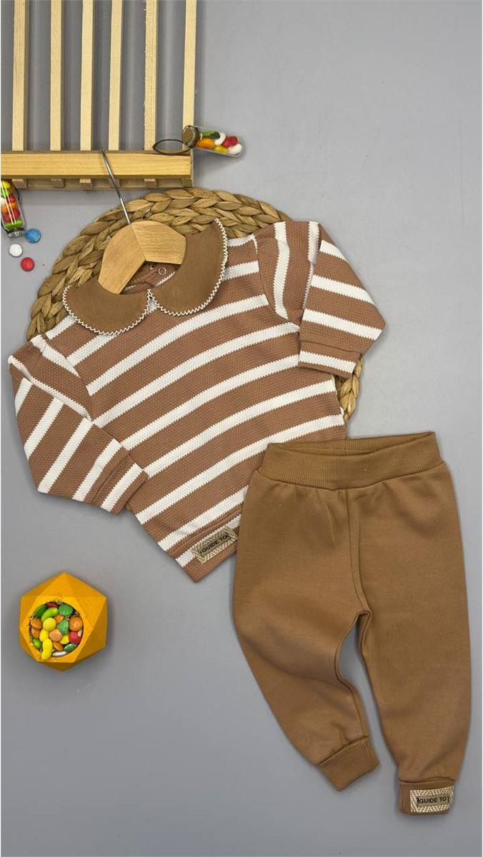 2178 Çizgili Kroşatalı Jakarlı Kız Takım KAHVERENGİ