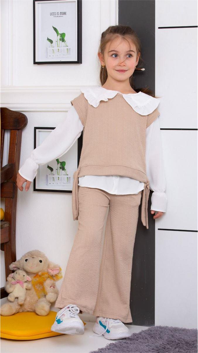 2369 İspanyol Paça Gömlekli Üçlü Kız Takım BEJ