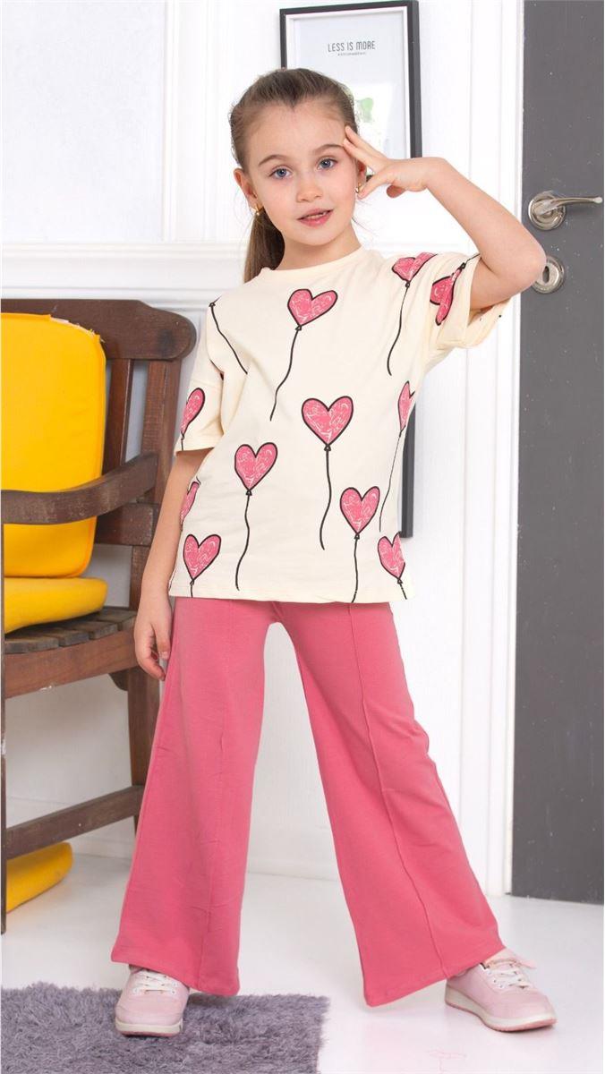 2380 Kalp Desenli İspanyol Paça Kız Çocuk Takım PEMBE