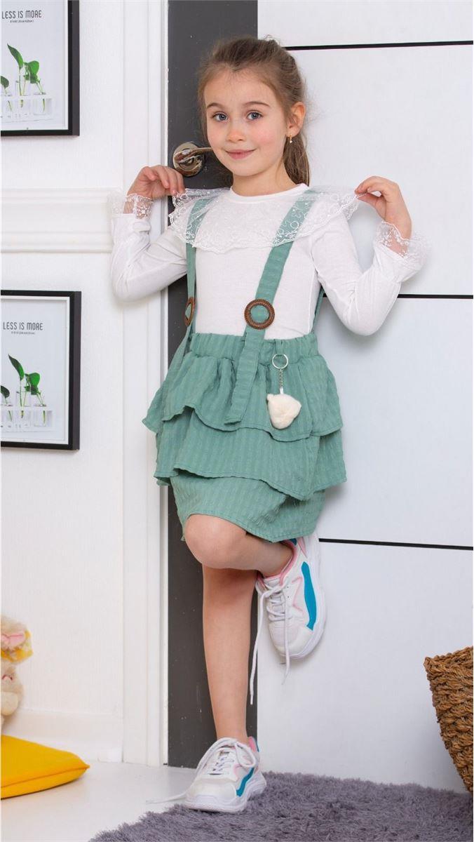 2385 Bebe Yaka Kol Detaylı Ayıcıklı İkili Salopet SU YEŞİLİ