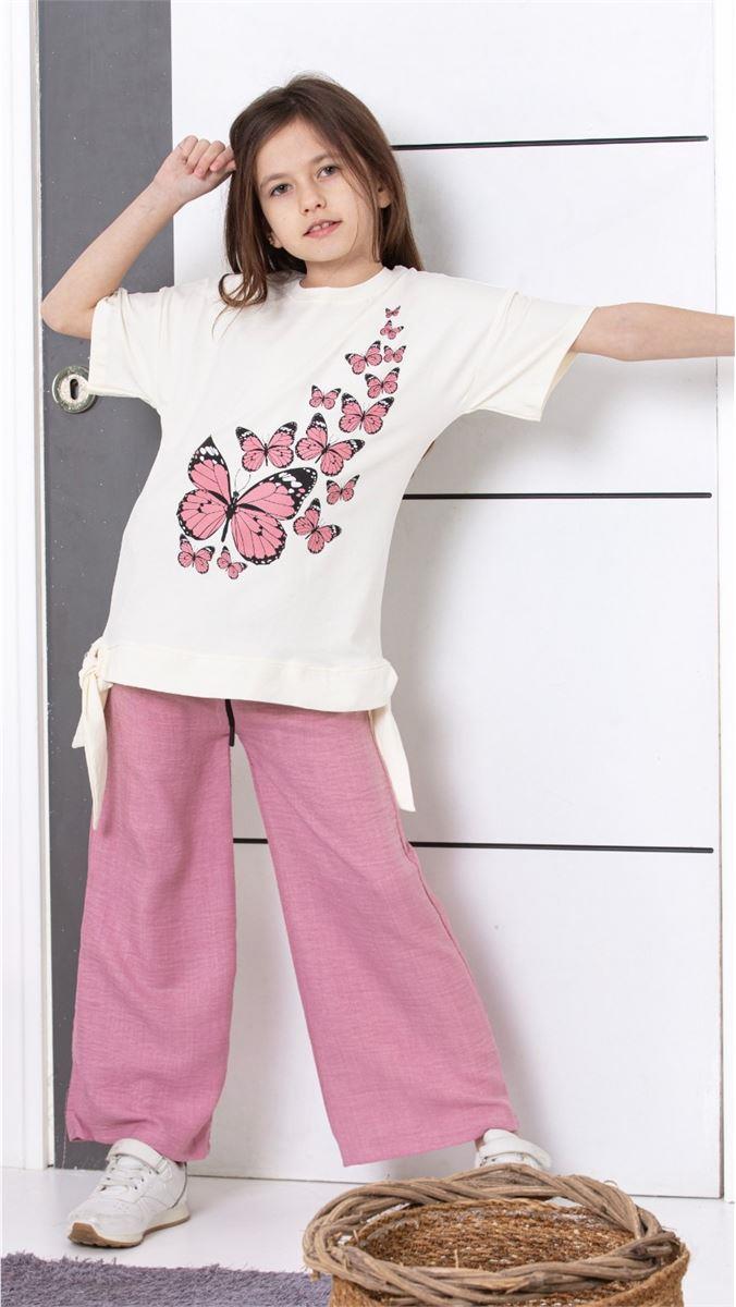 2396 Çiçek Desenli Keten Pantolon İkili Kız Takım PEMBE