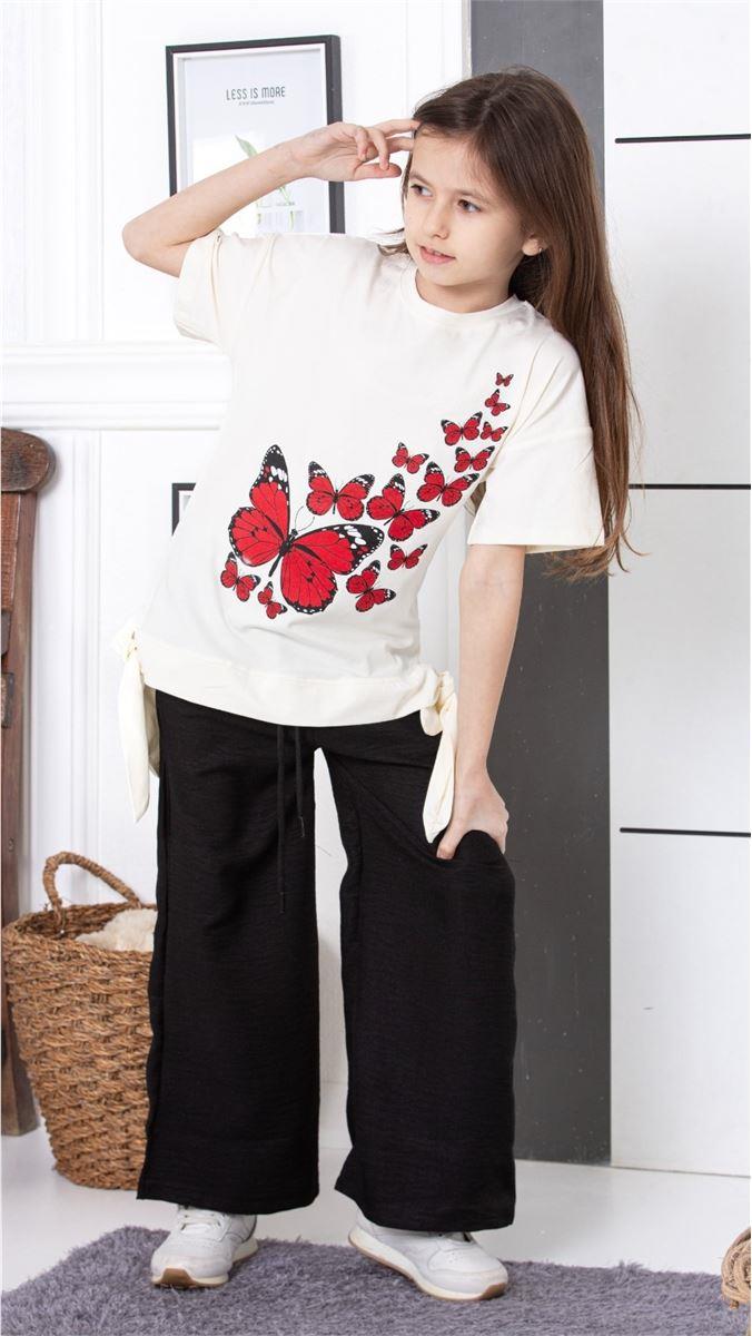 2396 Çiçek Desenli Keten Pantolon İkili Kız Takım SİYAH