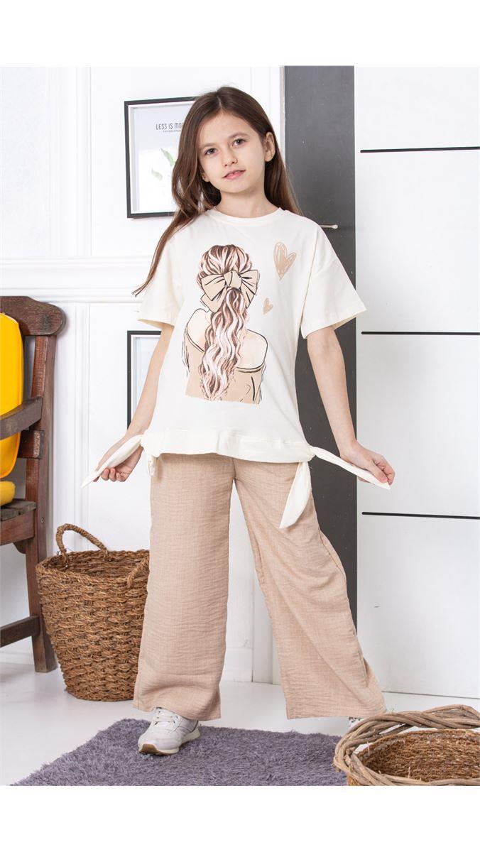 2397 Örgü Saç & Kalp Desenli Keten Pantolon İkili Kız Takım BEJ