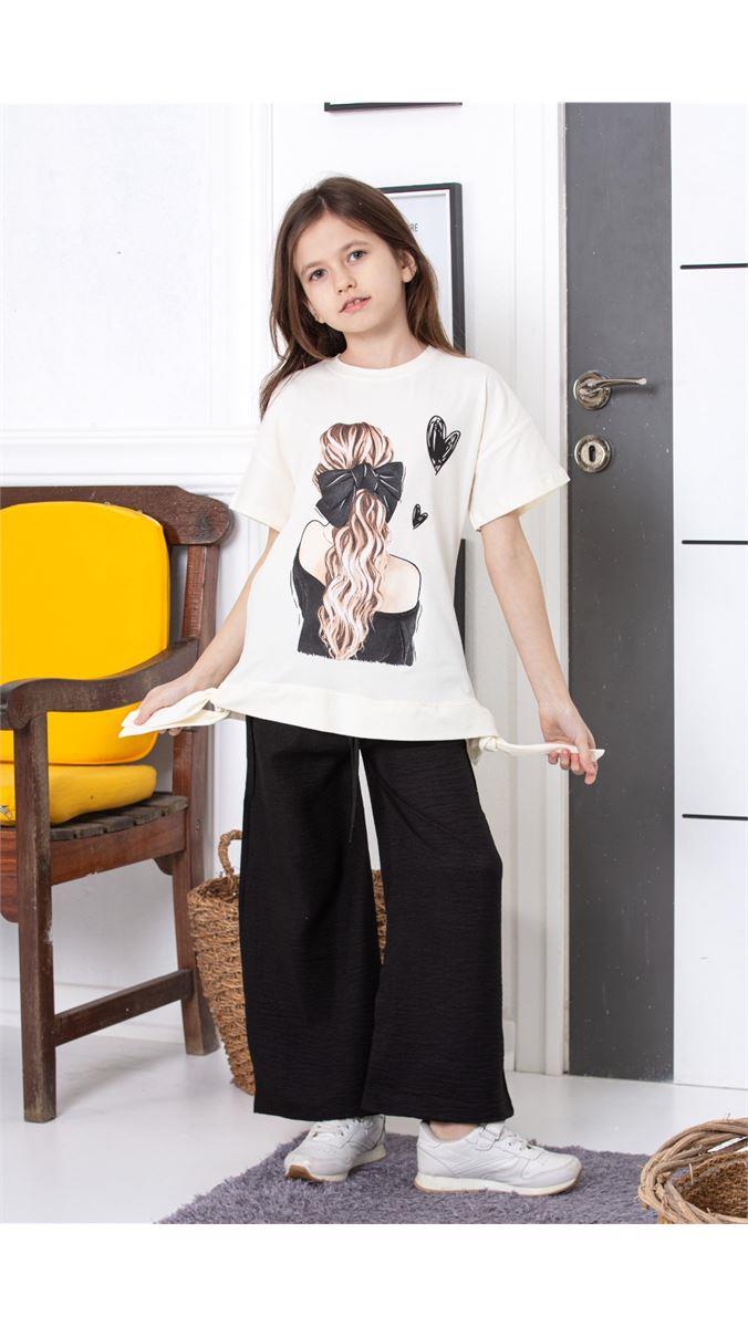 2397 Örgü Saç & Kalp Desenli Keten Pantolon İkili Kız Takım SİYAH