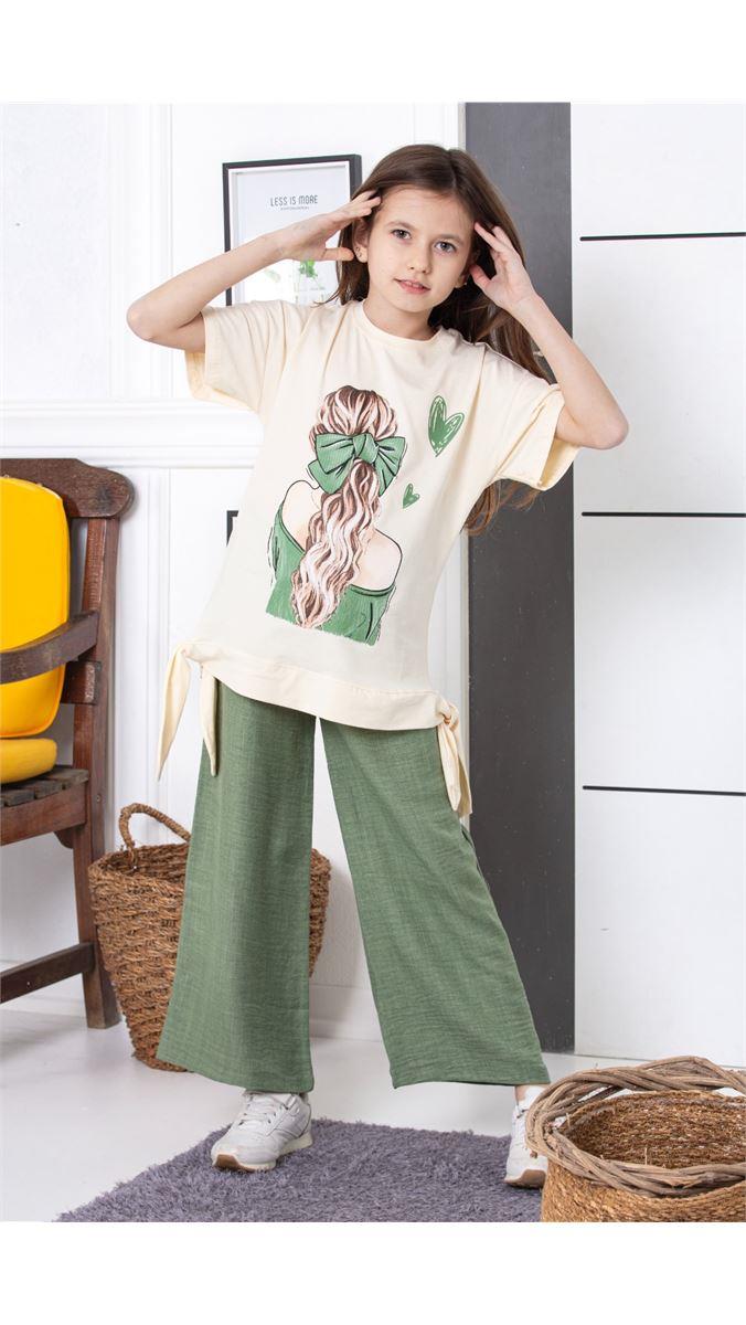 2397 Örgü Saç & Kalp Desenli Keten Pantolon İkili Kız Takım YEŞİL