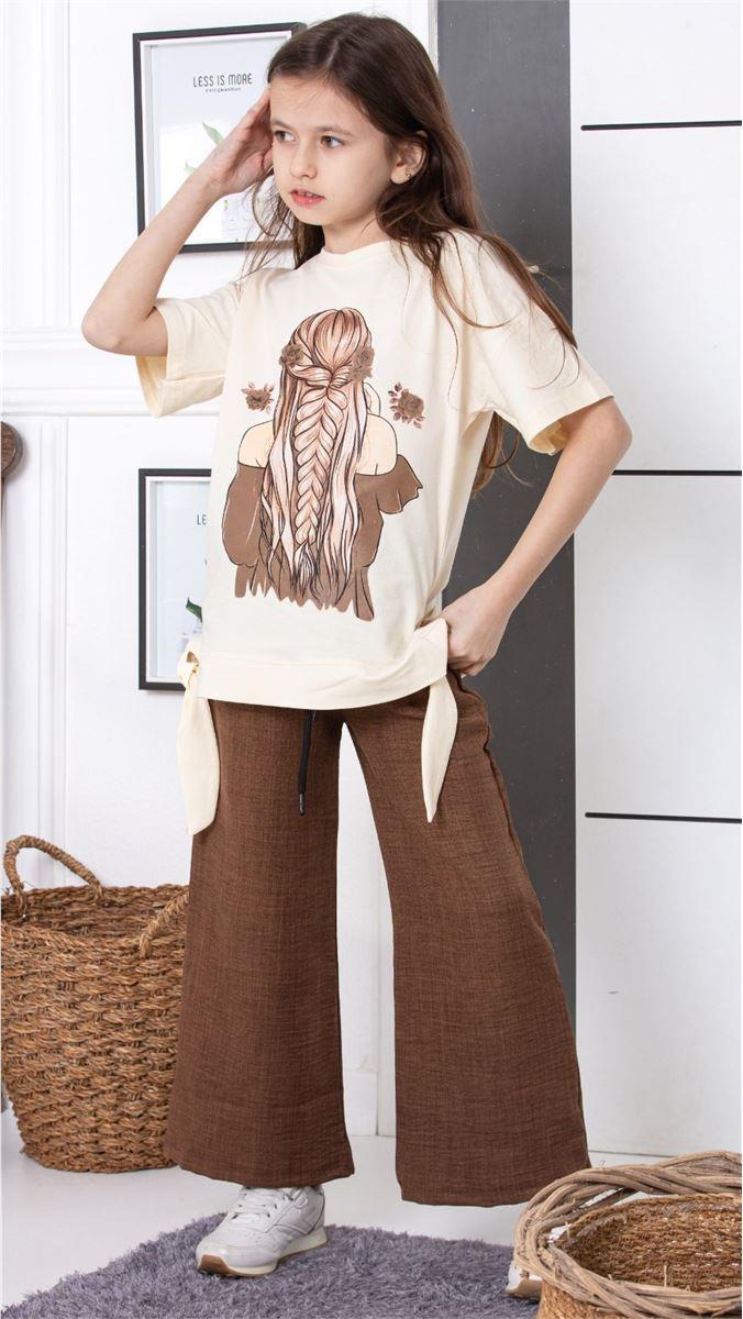 2398 Örgü Saç & Çiçek Desenli Keten Pantolon İkili Kız Takım KAHVERENGİ