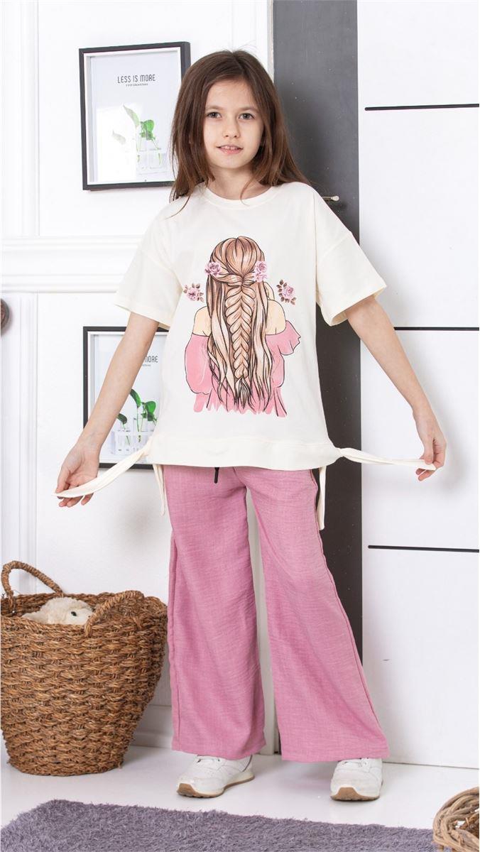 2398 Örgü Saç & Çiçek Desenli Keten Pantolon İkili Kız Takım PEMBE