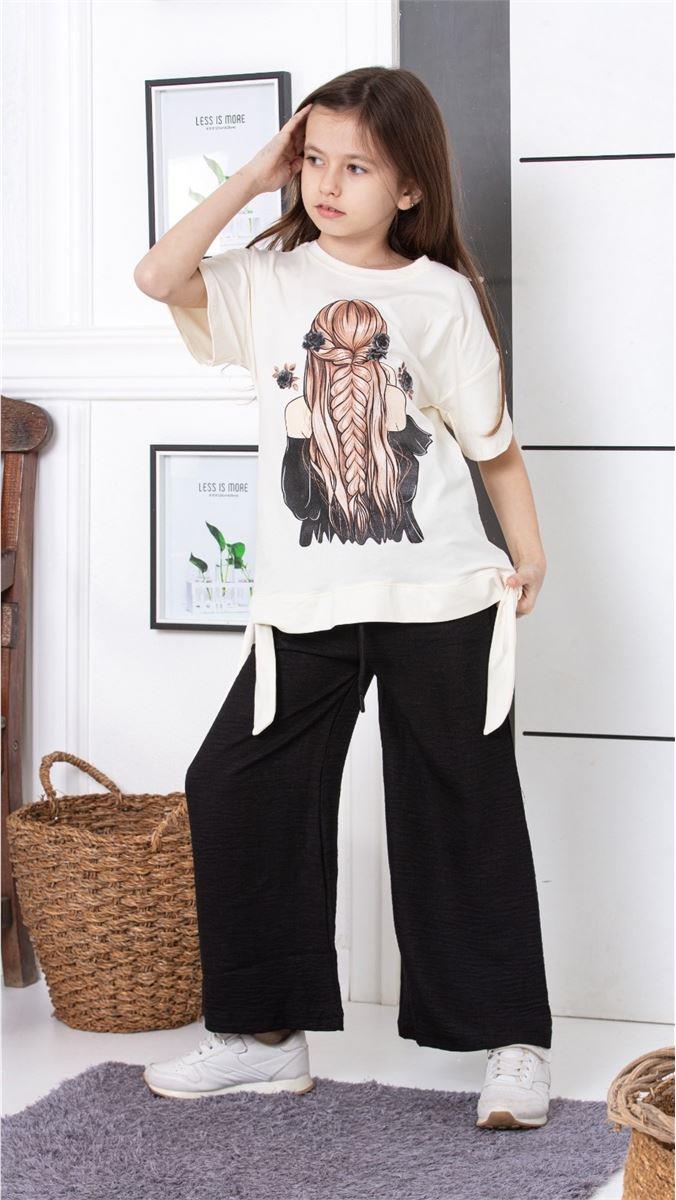 2398 Örgü Saç & Çiçek Desenli Keten Pantolon İkili Kız Takım SİYAH