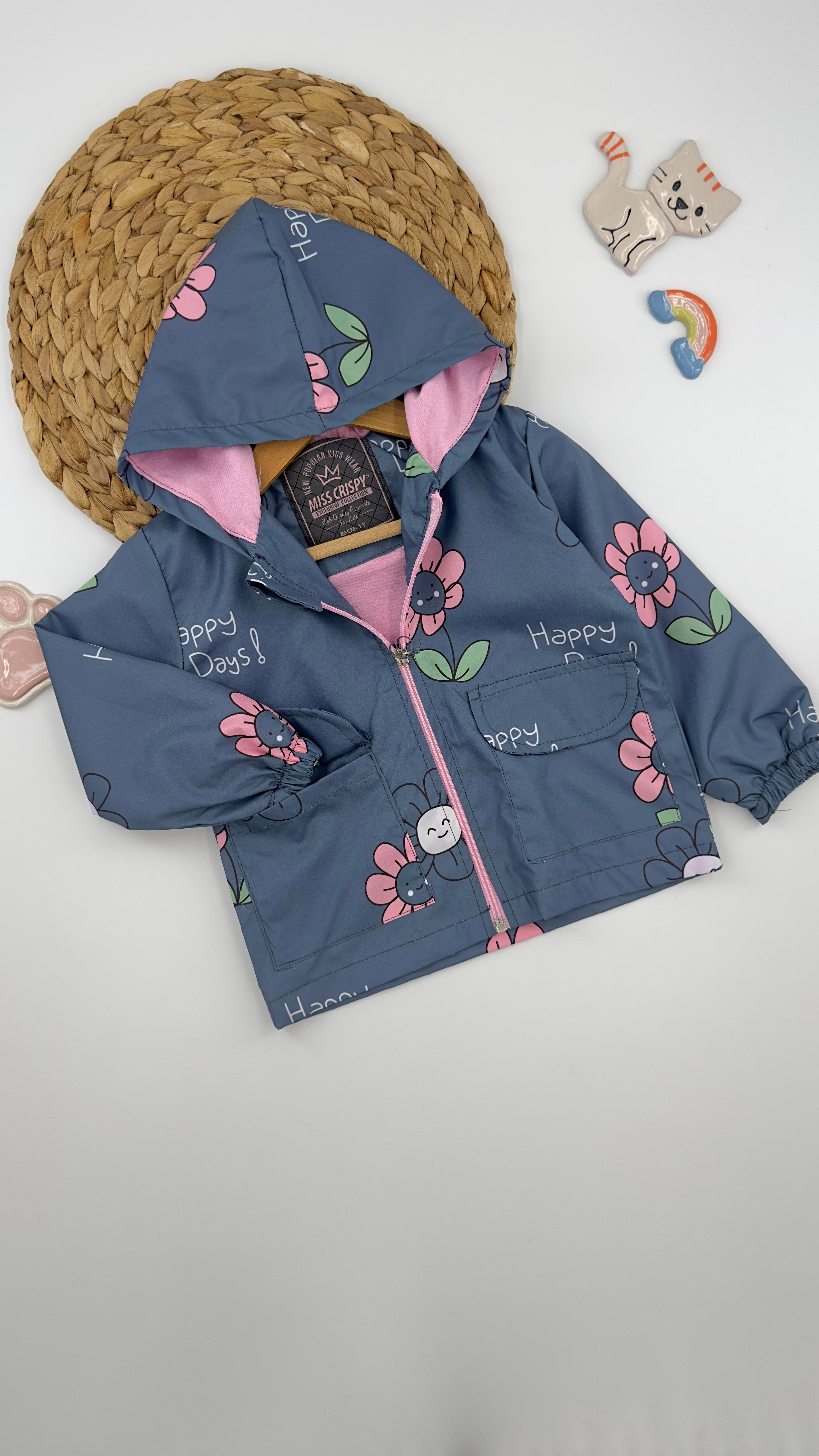 24209 Gülen Papatyalı Kapak Cepli Kız Yağmurluk GRİ