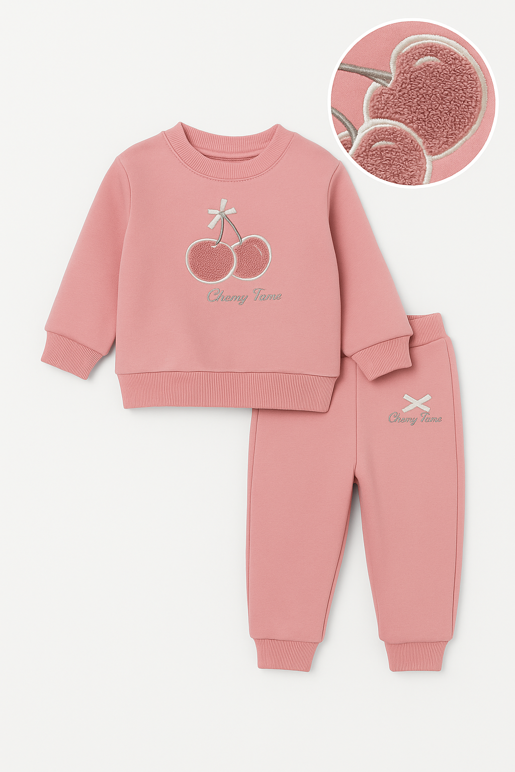 252032 Cherry Time Kiraz Nakışlı Üç İplik Şardonlu Takım PEMBE