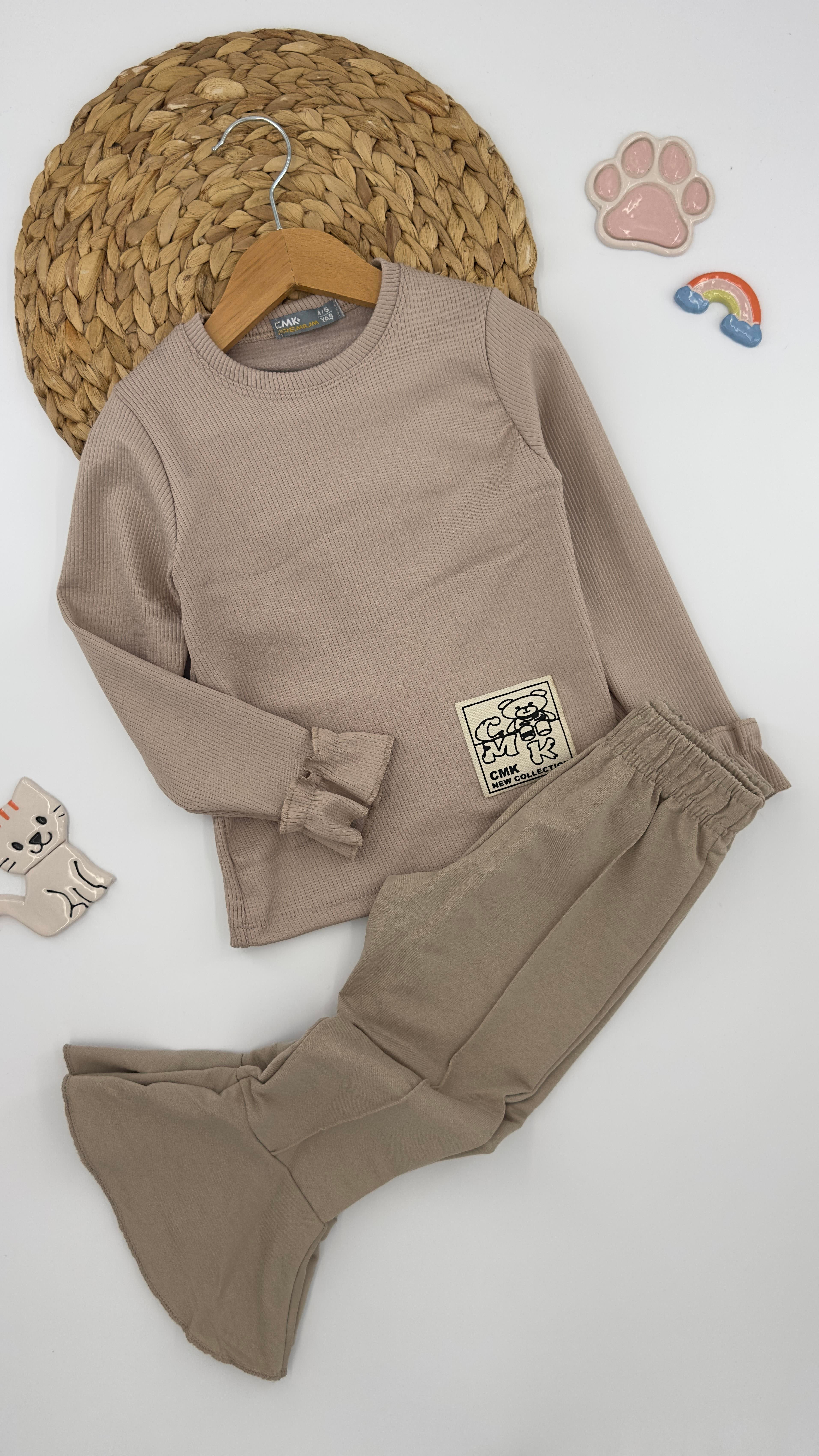 27090 İspanyol Paça Ayıcık Armalı Kolu Fırfırlı Kız Takım BEJ