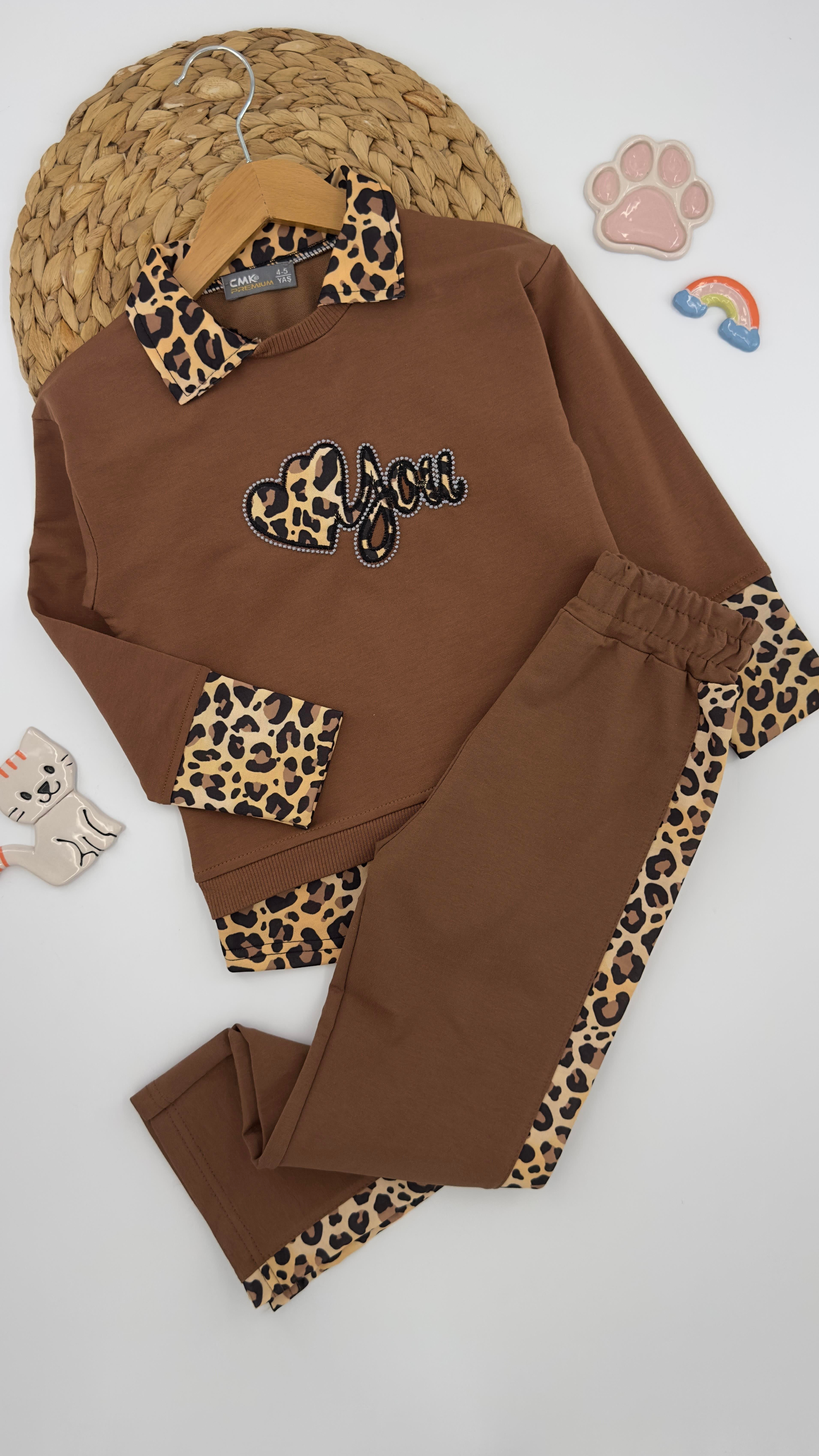 27090 Leopar Gömlek Görünümlü Kalp Yaka Detaylı Takım KAHVE